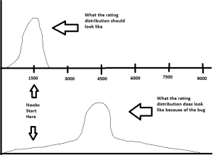 The three important features are that the bulk of the distribution is off by thousands of points from where it should be, noobs start thousands of points below the bulk, and players are spread over an absurdly wide range. The curves are obviously hand-drawn in Paint, so don’t read anything beyond that into the precise shapes.